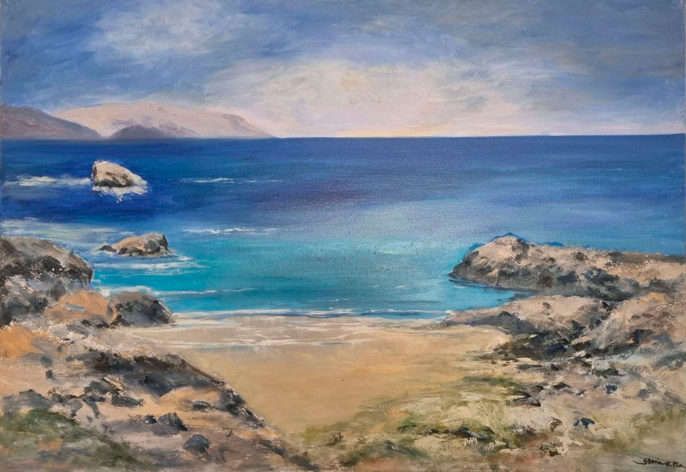 Paisatge marí que mostra la calma d’una cala solitària. El contrast entre els blaus profunds del mar i els tons terrosos de les roques transmet sensació d’aïllament i llibertat.