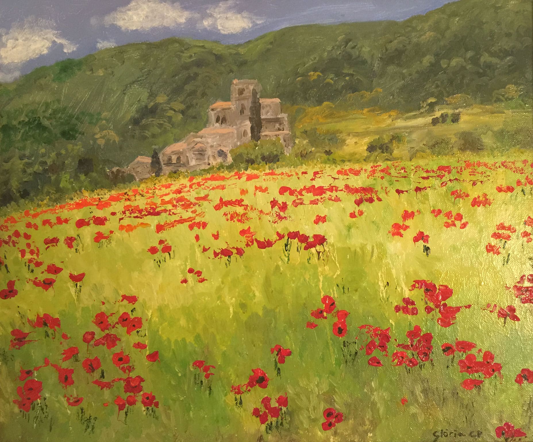 Un cant a la natura i al color. Aquest paisatge rural transmet la força de la terra i la vitalitat de les roselles que ballen amb el vent, amb un poble antic que s’insinua al fons.