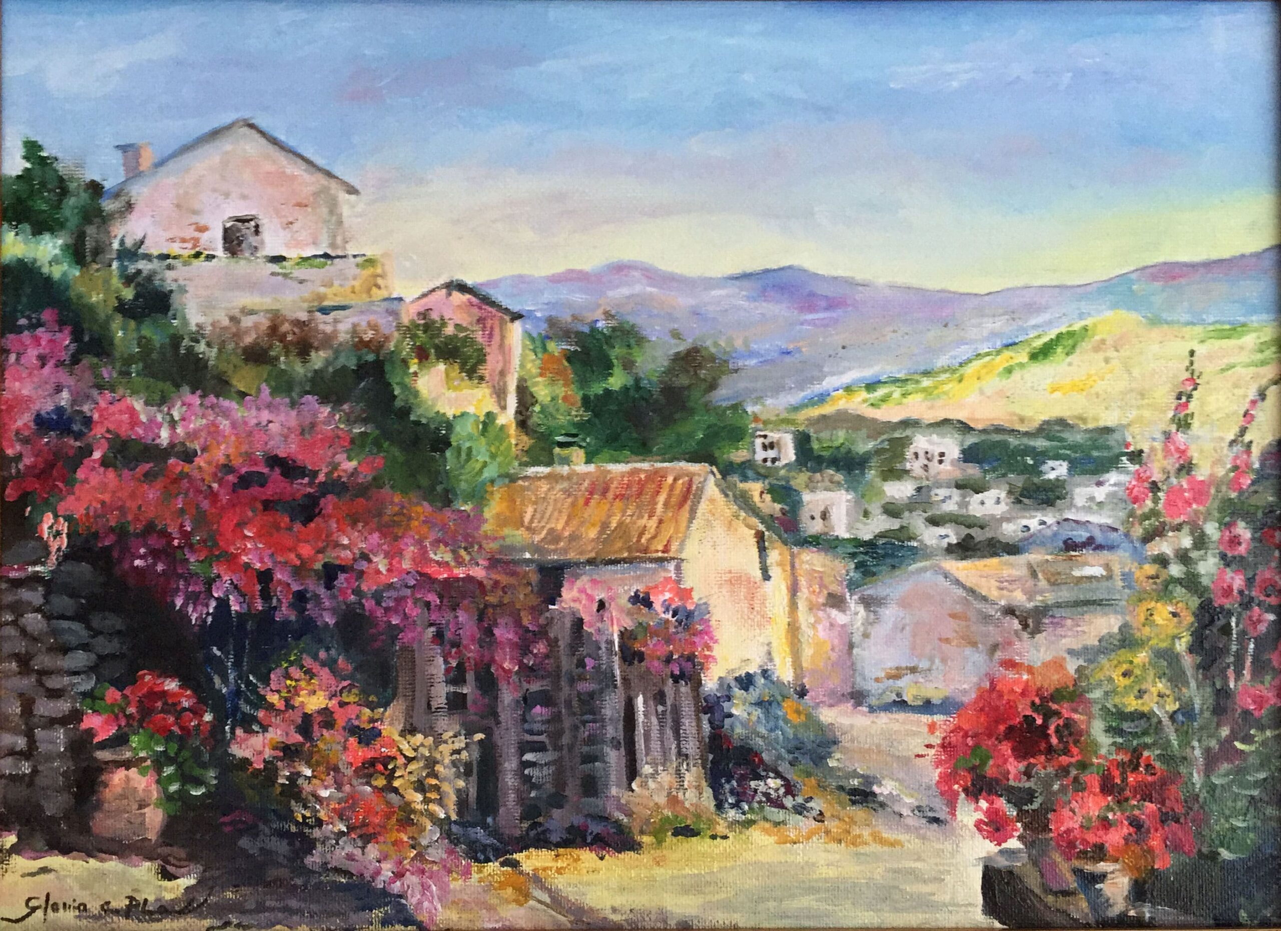 Escena que retrata la bellesa dels pobles mediterranis, amb buganvíl·lies i flors que omplen els carrers de color i vida.