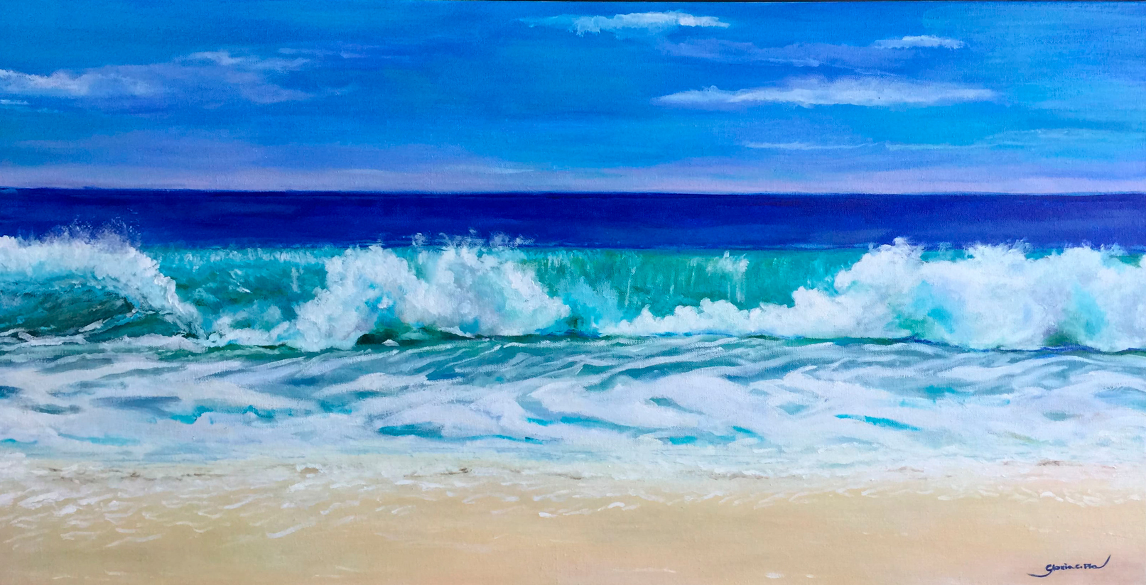 Obra marina que captura l’instant en què l’onada es desvetlla i s’alça. Pincellada enèrgica i textura a l’escuma que transmet frescor i moviment. Paleta de blaus, turqueses i sorra suau.