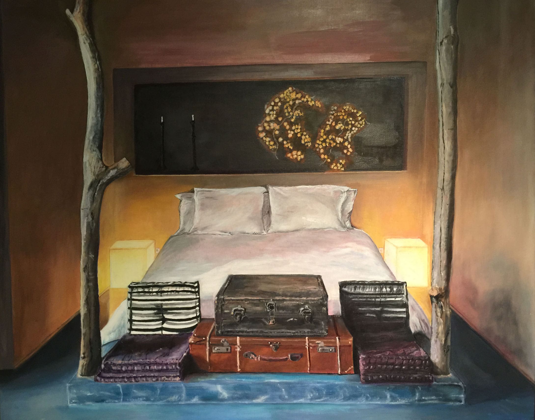 Aquesta peça juga amb la idea del viatge interior. Les maletes tancades i la llum càlida conviden a la introspecció.