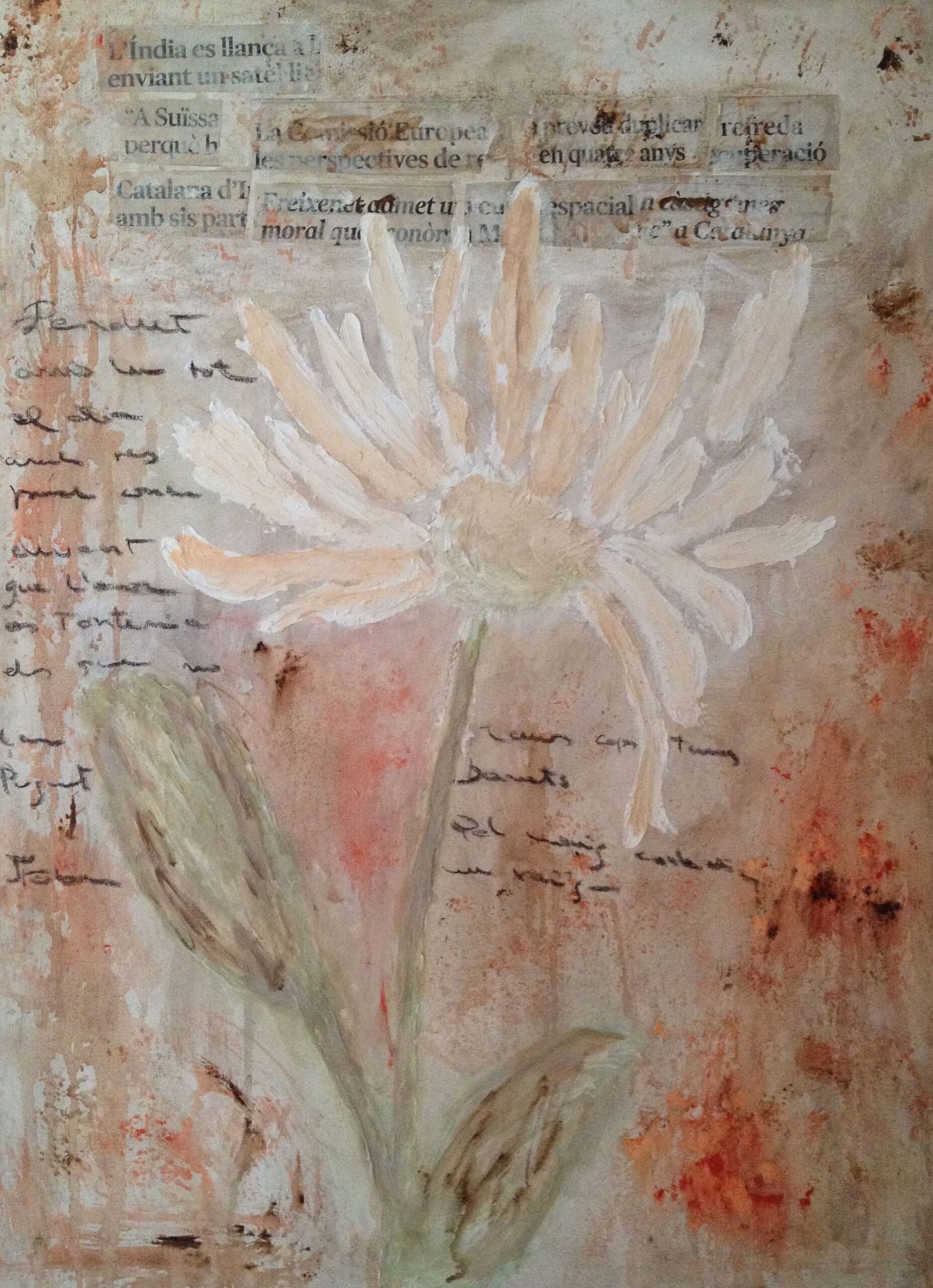 Aquesta obra combina elements naturals i texturals. La flor, pintada amb delicadesa, emergeix entre capes de text i pigments terrosos, creant un diàleg entre natura i memòria.