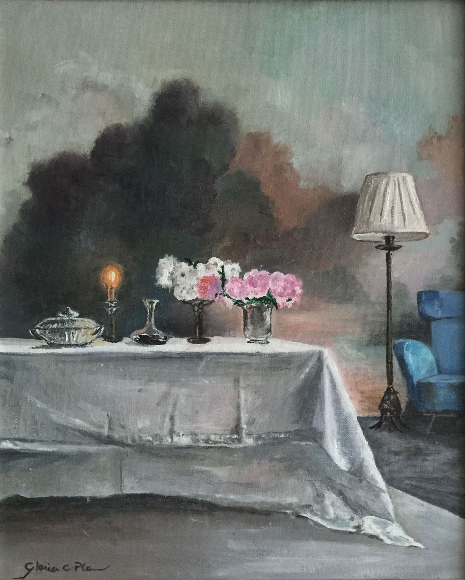 Obra plena de romanticisme i equilibri lumínic. Els reflexos, la llum càlida i la disposició dels objectes evoquen serenitat i bellesa clàssica.